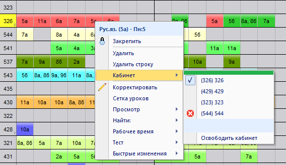Урок, помещенный в кабинет, может быть освобожден с помощью команды Освободить кабинет, которая откроется после нажатия правой кнопки мышки на карточке урока. Команда не доступна, если урок не помещен в кабинет.