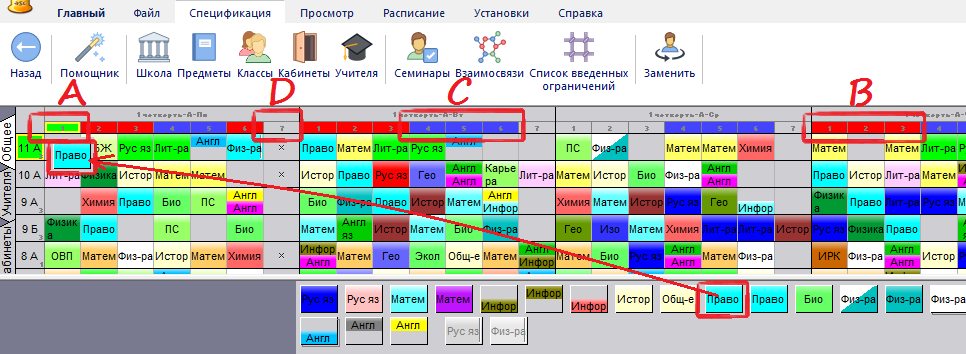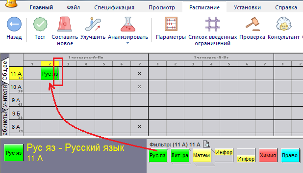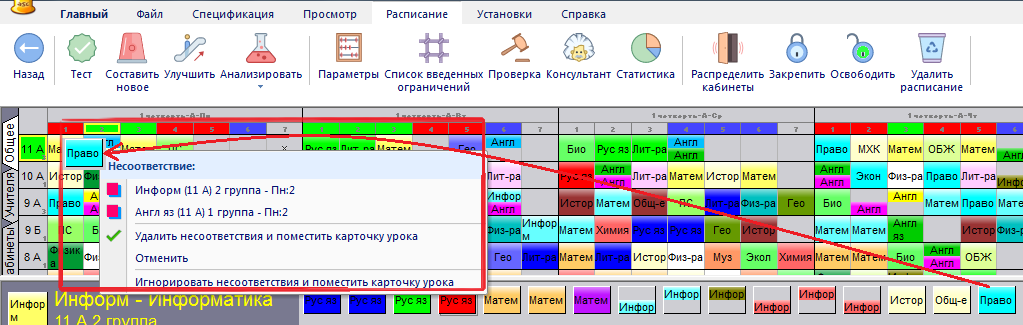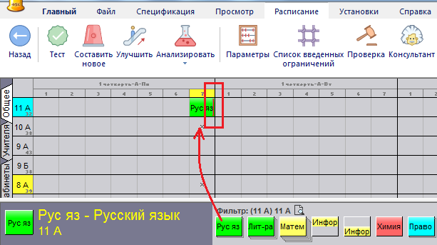 Точно так же программа разрешит Вам поставить урок и в не позволенную позицию, но предупредит Вас красной полосой на карточке урока.