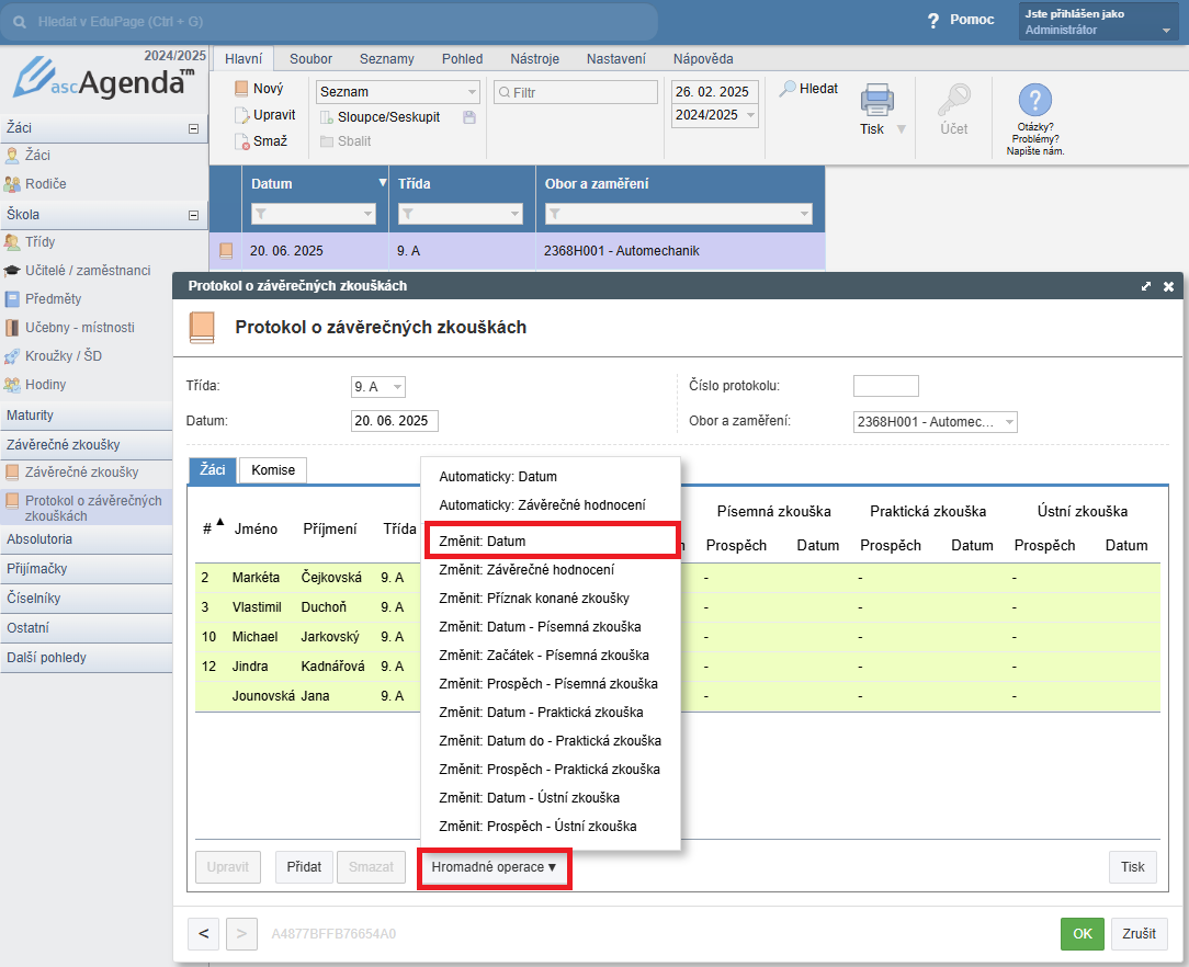 Dátum záverečných skúšok alebo prospech potom môžte nastaviť ručne alebo viacerím žiakom naraz cez hromadné operácie