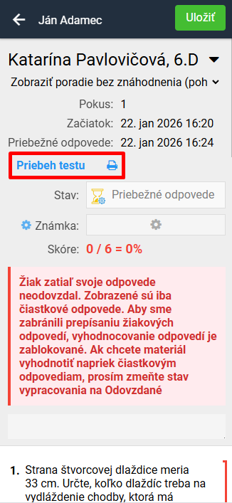 Informácie o priebehu testu u konkrétneho žiaka (mobilná aplikácia)