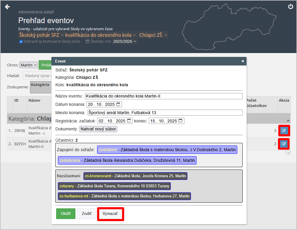 Pri chybne zadaných vlastnostiach udalosti ich viete upraviť (zmeny sa v krátkom čase prejavia aj v EduPAge daných škôl, prípadne je možné event aj vymazať.)