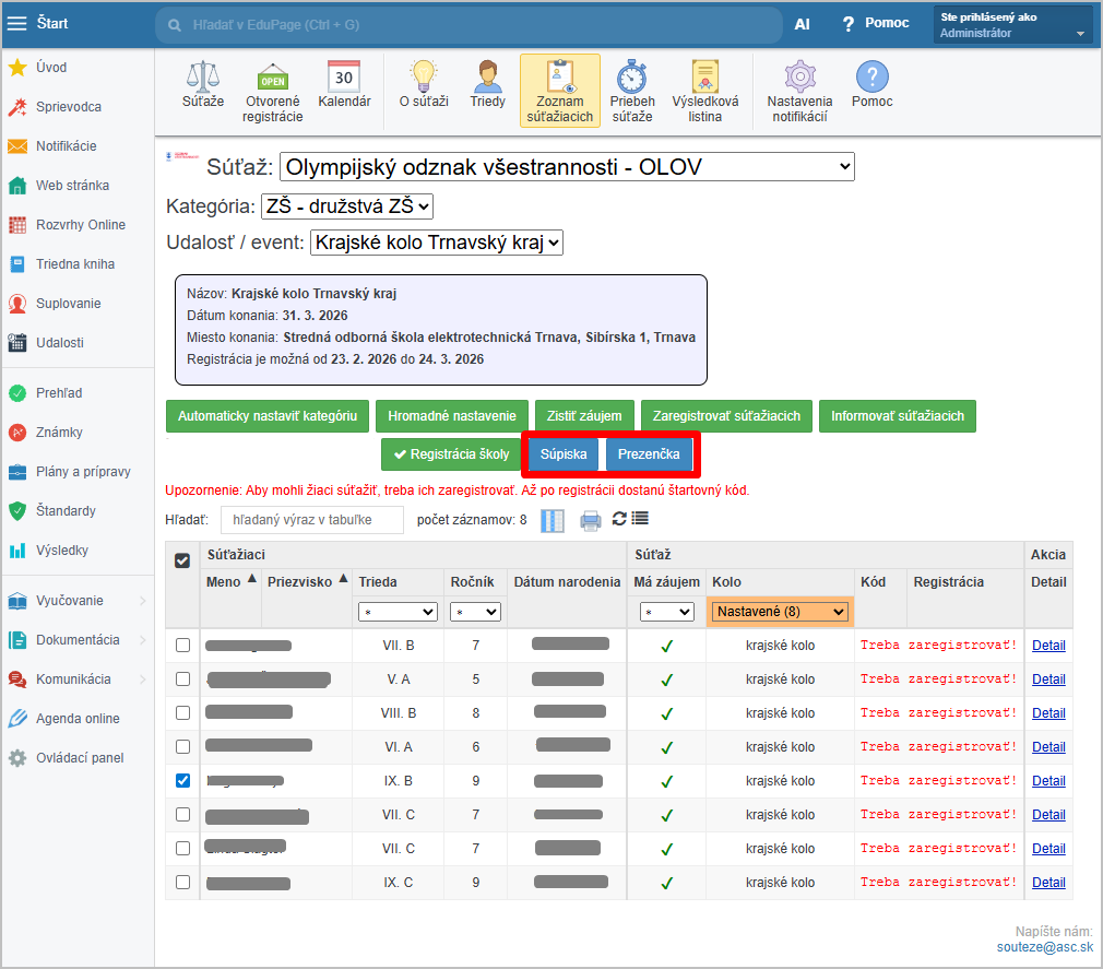 V časti Zoznam súťažiacich kliknite na "Súpiska" a "Prezenčka":