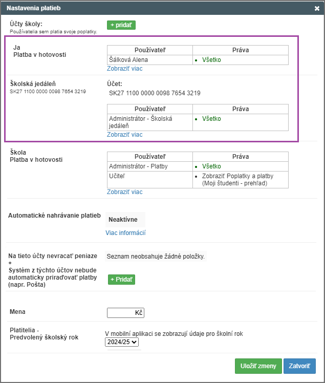 a.) V učiteľskom konte Michala Prísneho to v Nastaveniach vyzerá takto - učiteľ má pridelené právo od administrátora vidieť poplatky a platby svojich žiakov pre účet Školský účet a nemôže upravovať práva.