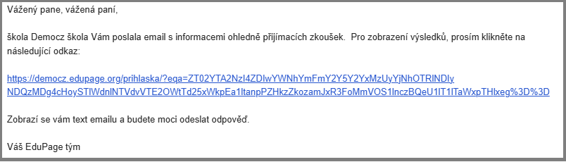 Prostredníctovom správy v EduPage alebo e-mailom uchádzač obdrží odkaz na stránku školy, kde nájde text správy vašej školy.