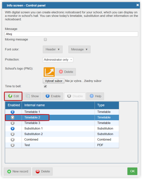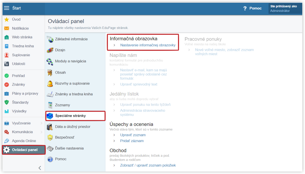 Pomocou tejto funkcie si môžete vytvoriť elektronickú nástenku vašej školy, ktorú môžete zobraziť na monitore umiestnenom na chodbe vašej školy. Na obrazovke môžete mať zobrazený aktuálny rozvrh, suplovanie a ďalšie informácie.