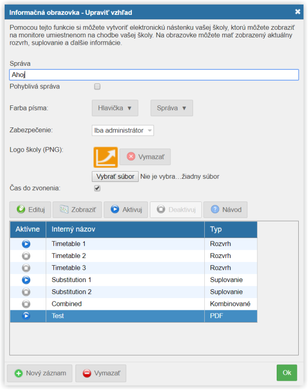 Ak už ste si nastavili obrazovku, ešte pred tým, ako ju budete chcieť použiť, musíte ju aktivovať tlačidlom Aktivuj. Ako administrátor si môžete obrazovku prezrieť aj keď nie je aktívna.