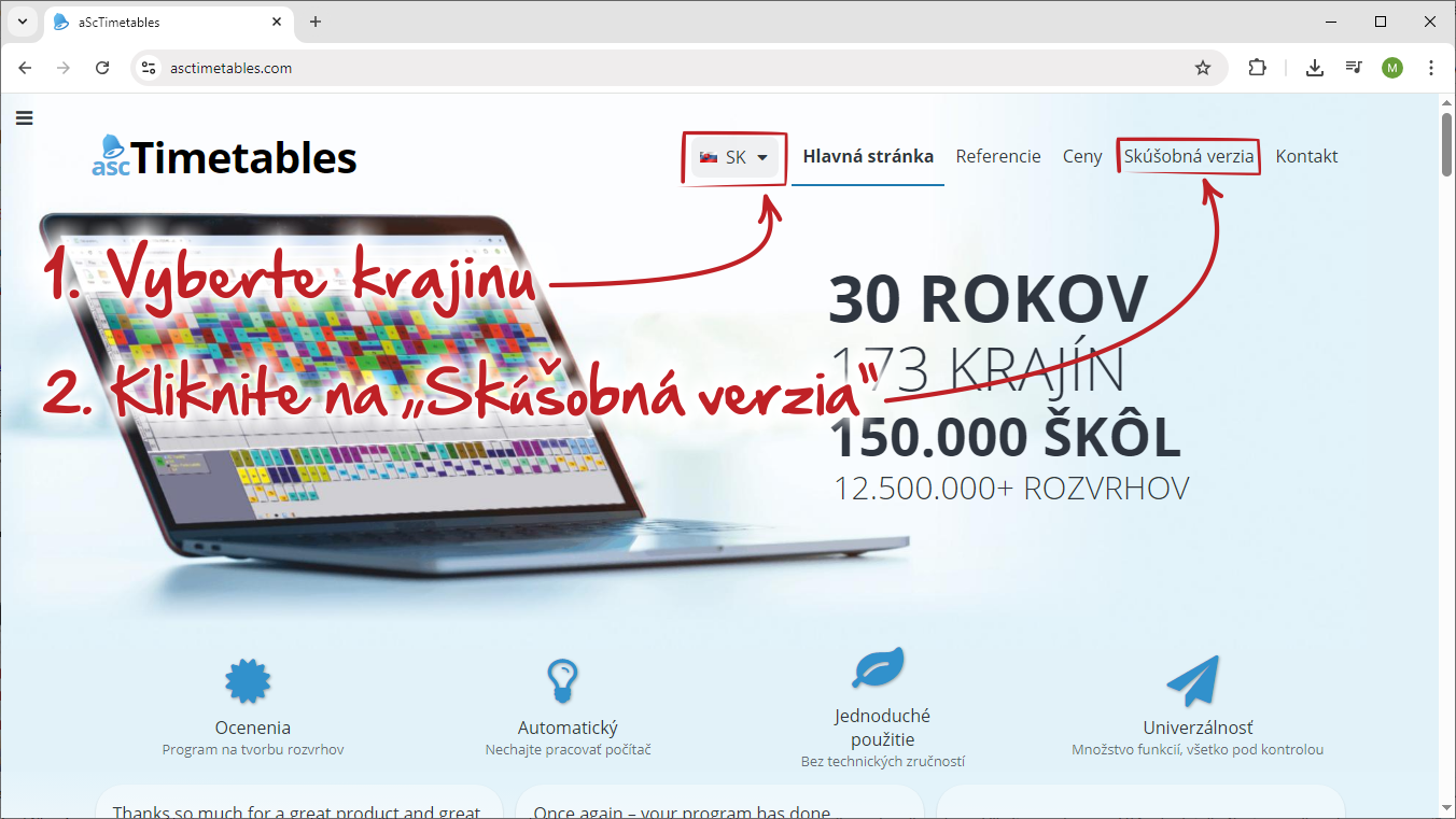 1. Najprv si vyberte krajinu - Slovensko (1.) a kliknite na "Skúšobná verzia" (2.)