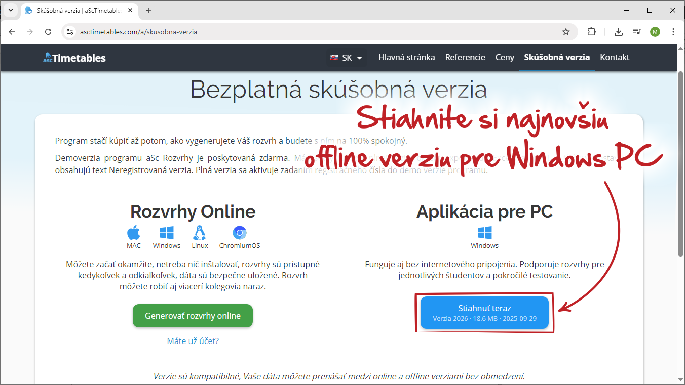 Najnovšiu verziu programu aSc Rozvrhy pre operačný systém Windows si vždy môžete stiahnuť priamo z našej stránky http://www.asctimetables.com.
