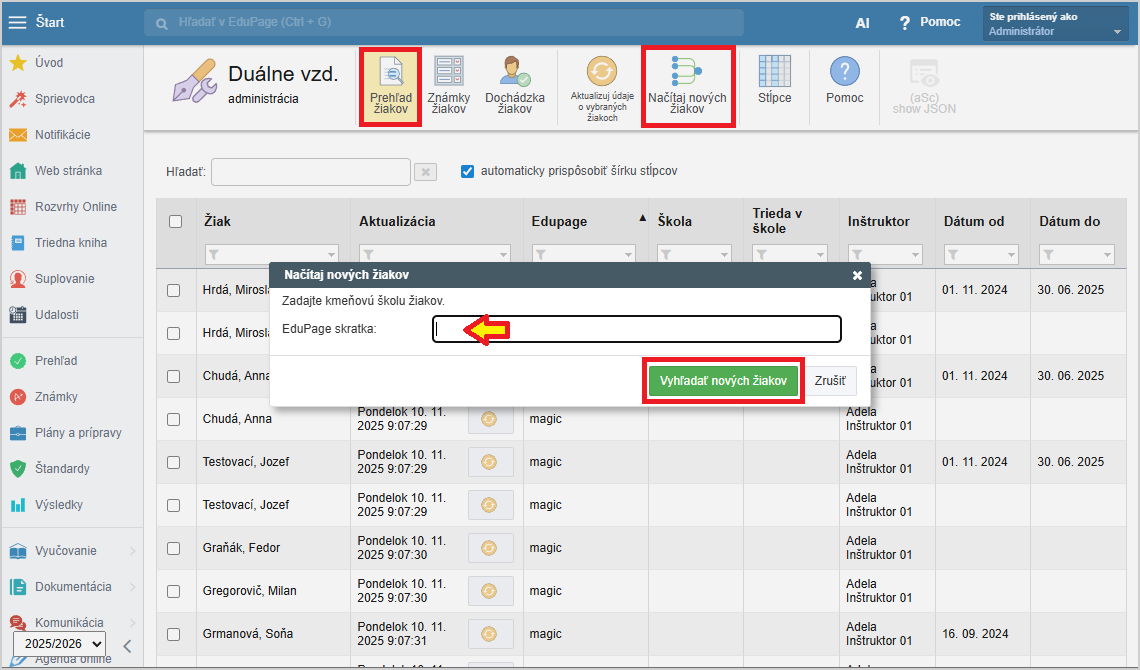 Vo vašom EduPage v module Duálne vzdelávanie v sekcii Prehľad žiakov kliknite na funkciu Načítaj nových žiakov.