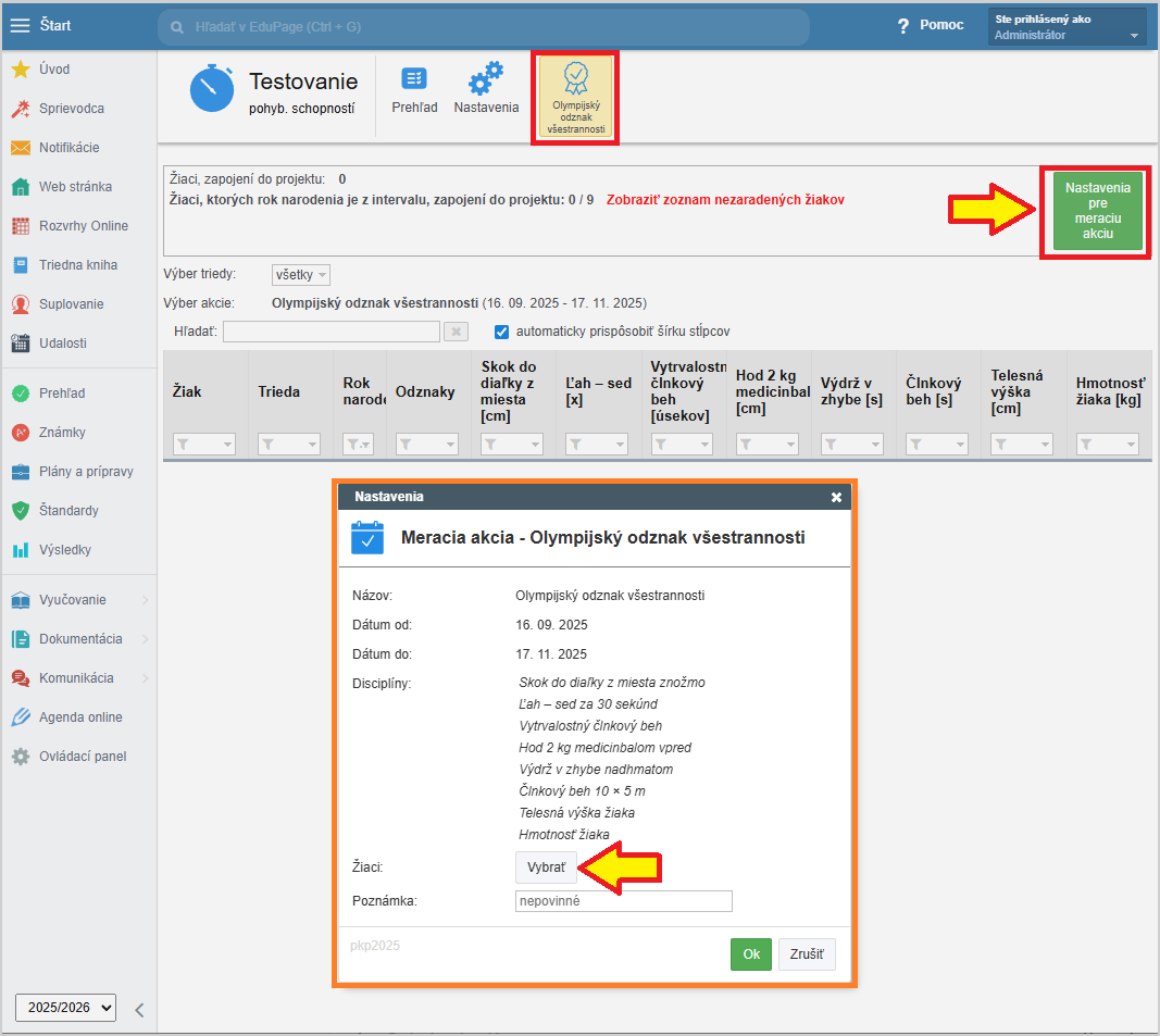 Následne už vaši poverení učitelia, ktorých ste určili, vedia priamo v EduPage v období 16. 09. 2025 - 17. 11. 2025 zapisovať merané hodnoty pre 6 disciplín Olympijského odznaku všestrannosti a telesnú výšku a hmotnosť žiaka: