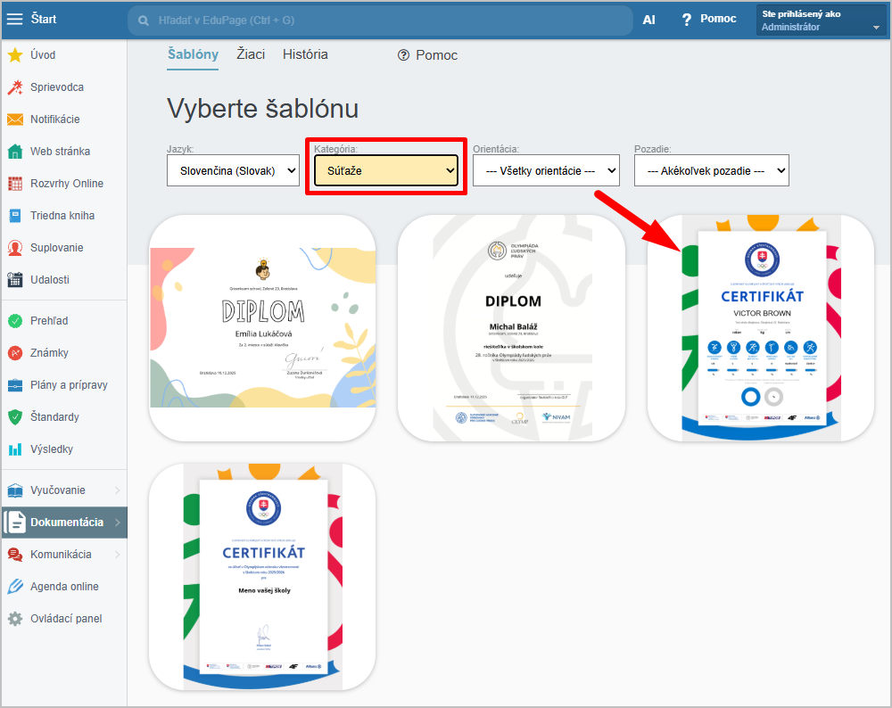 Vyfiltrujte diplomy v kategórii Súťaže a vyberte označený diplom.