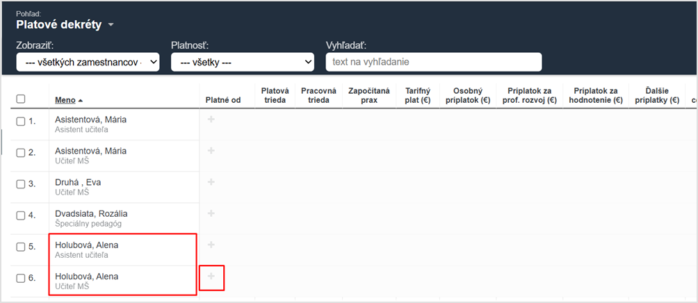 Kliknite na znamienko "+" pri mene zamestnaca, ktorému chcete vytvoriť platový dekrét. Ak má zamestnanec viac pracovných pomerov, v zozname sa zobrazí viackrát – pri každom s príslušnou pracovnou pozíciou. Následne si vyberieme ten pracovný pomer, ku ktorému chceme vytvoriť platový dekrét.