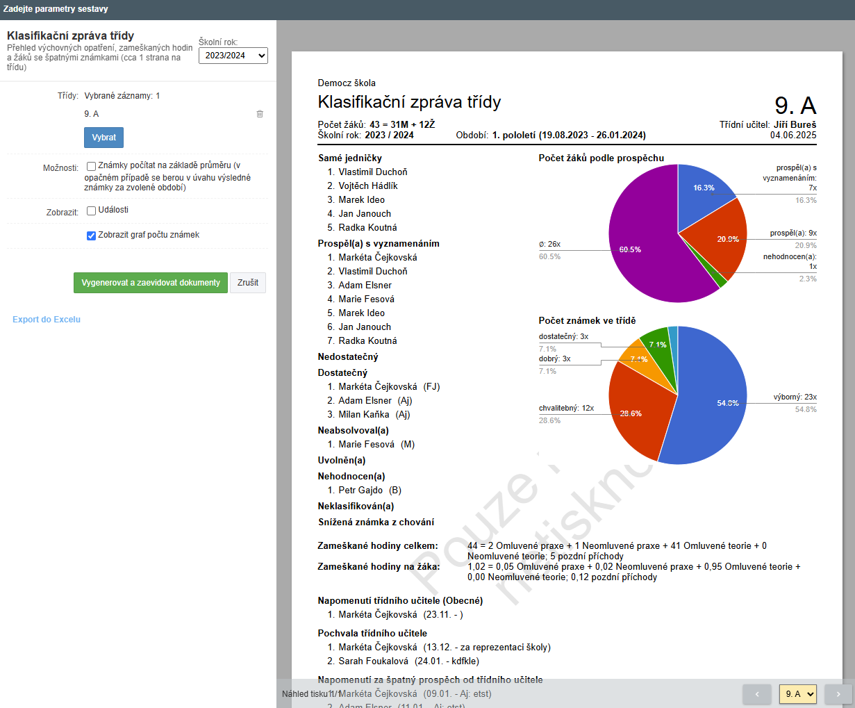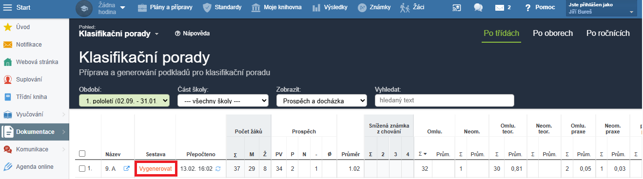 Třídní učitel může vygenerovat klasifikační zprávu za svou třídu takto: