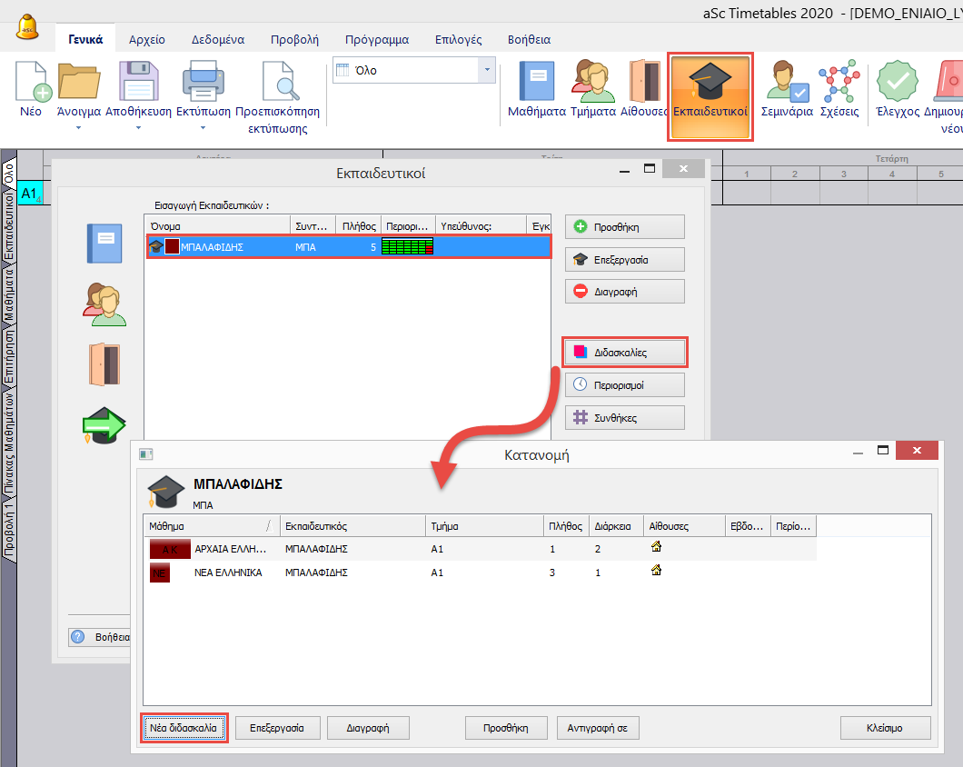 Οι διδασκαλίες είναι το πιο σημαντικό στοιχείο για την δημιουργία του προγράμματος. Οι διδασκαλίες μπορούν να δημιουργηθούν από τα μενού Γενικά/Εκπαιδευτικοί/Διδασκαλίες , Γενικά/Τμήματα/Διδασκαλίες, Γενικά/Μαθήματα/Διδασκαλίες, Γενικά/Αίθουσες/Διδασκαλίες.