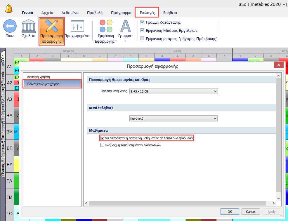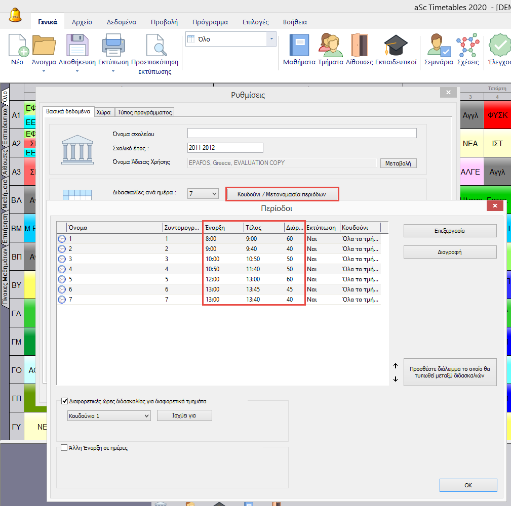 Στην περίπτωση που το εκπαιδευτήριό σας έχει διδασκαλίες διαφορετικής διάρκειας μπορείτε να κατευθυνθείτε στο μενού Επιλογές/Προσαρμογή εφαρμογής/Ειδικές επιλογές χώρας, επιλέξτε Να επιτρέπεται η εισαγωγή μαθημάτων σε λεπτά ανά εβδομάδα.