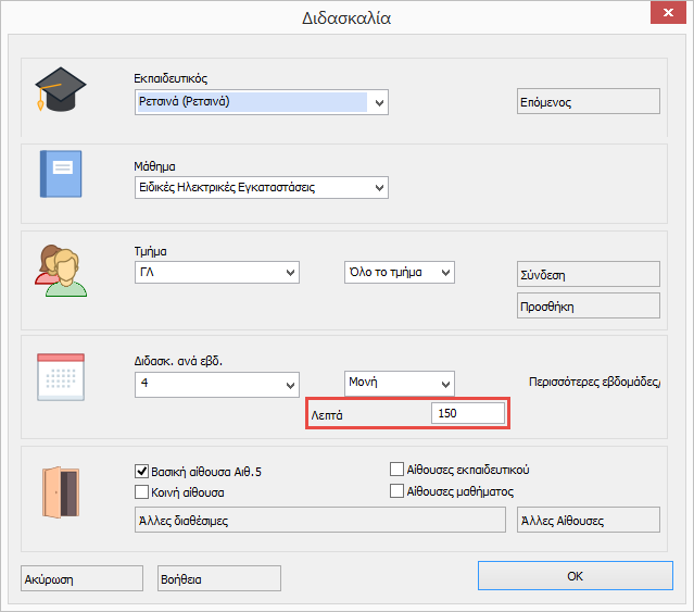 Σημείωση: Θα πρέπει επίσης να παρέχετε τον αριθμό των διδασκαλιών ανά εβδομάδα. Άρα αν τα μαθηματικά για παράδειγμα διαρκούν 150 λεπτά και το πλήθος των διδασκαλιών είναι 3 το πρόγραμμα μπορεί να αποφασίσει εάν η διδασκαλία θα γίνει σε 60+40+60 ή 50+50+50 λεπτά.
