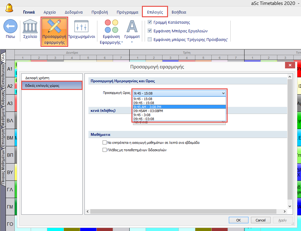 Στο μενού Επιλογές/Προσαρμογή εφαρμογής/Ειδικές επιλογές χώρας μπορείτε να αλλάξετε την μορφή της ώρας που θα χρησιμοποιηθεί στις εκτυπώσεις στην αρχή και στο τέλος της περιόδου.