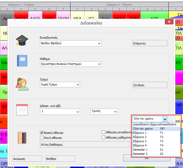 Για κάθε διδασκαλία μπορείτε να ορίσετε σε ποια εξάμηνα θα υλοποιηθεί. Μπορεί να προσδιορίσετε ένα εξάμηνο ή σε οποιοδήποτε εξάμηνο ή σε όλα τα εξάμηνα. Περαιτέρω μπορείτε να ορίσετε τις διδασκαλίες στο πρώτο και δεύτερο εξάμηνο ή στο πρώτο Ή το δεύτερο.