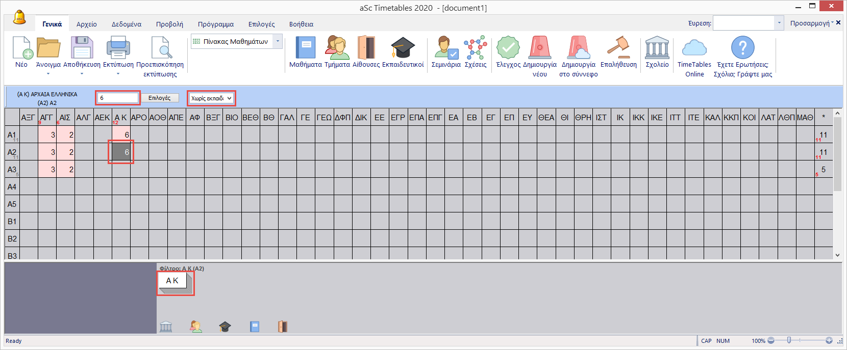 2.Πληκτρολογήστε το πλήθος των διδασκαλιών ανά εβδομάδα στο επιλεγμένο κελί.