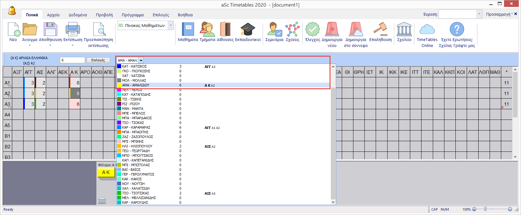 3. Όταν μάθετε ποιος εκπαιδευτικός θα διδάξει την διδασκαλία μπορείτε να του κάνετε ανάθεση. Πολύ απλά επιλέξτε την διδασκαλία και πληκτρολογήστε το πρώτο γράμμα του ονόματος του εκπαιδευτικού ή κάντε κλικ στο όνομά του.