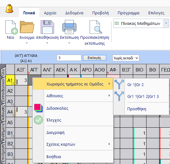 1. Επιλέξτε το μάθημα και το τμήμα κάνοντας κλικ στο αντίστοιχο κελί. Πληκτρολογήστε 3 για το πλήθος των διδασκαλιών ανά εβδομάδα. Μετά κάντε δεξί-κλικ στην διδασκαλία και επιλέξτε την Κατηγορία.