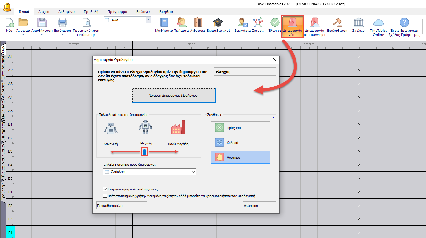 Η πολυπλοκότητα της δημιουργίας σχετίζεται με την ώρα που θα χρειαστεί ο Η/Υ για την δημιουργία του Ωρολογίου Προγράμματός σας.