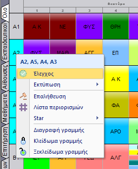 Μπορείτε να κάνετε έλεγχο σε πολλαπλά τμήματα/μαθήματα/εκπαιδευτικούς/αίθουσες με αυτόν τον τρόπο: Πρώτα κατευθυνθείτε στην αντίστοιχη προβολή. Μετά επιλέξτε τις γραμμές που επιθυμείτε να ελέγξετε. Μπορείτε να τις επιλέξτε κάνοντας κλικ στις κεφαλίδες. Κάντε CTRL+Κλικ για να προσθέσετε γραμμές στην επιλογή σας και SHIFT+Κλικ για να προσθέσετε σειρά γραμμής με την μία. Μετά κάντε δεξί-κλικ σε μία από τις επιλεγμένες κεφαλίδες και επιλέξτε έλεγχος.