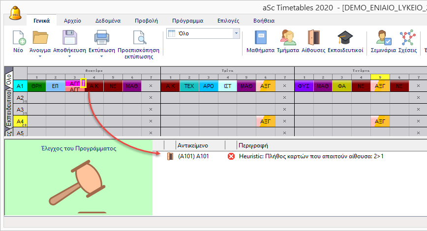 5. Μόλις τοποθετήσουμε την κάρτες από την ίδια κατηγορία μαζί το πρόγραμμα μας εμφανίζει ειδοποίηση ότι δεν είναι σωστή η θέση αυτή επειδή δεν υπάρχει ελεύθερη αίθουσα για τη διδασκαλία.