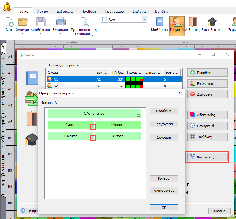 Εφόσον το πρόγραμμα μπορεί να τοποθετήσει στην ίδια περίοδο μόνο διδασκαλίες από την ίδια κατηγορία, δεν μπορεί να τοποθετήσει ταυτόχρονα τα “Αγόρια” και τις “Γυναίκες”.