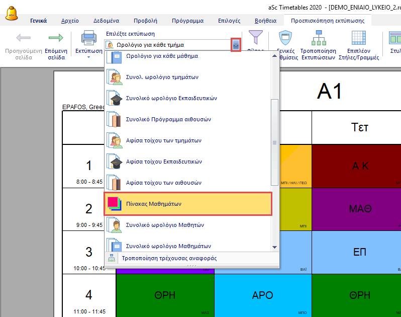 Μετά μπορείτε να επιλέξετε τον πίνακα μαθημάτων από την λίστα με τις διαθέσιμες εκτυπώσεις:
