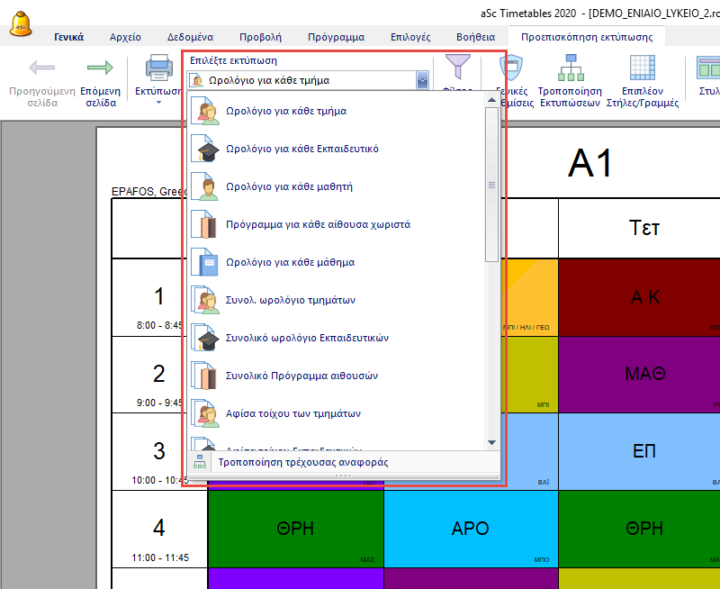 Μετά μπορείτε να επιλέξετε από την λίστα με τις διαθέσιμες εκτυπώσεις: