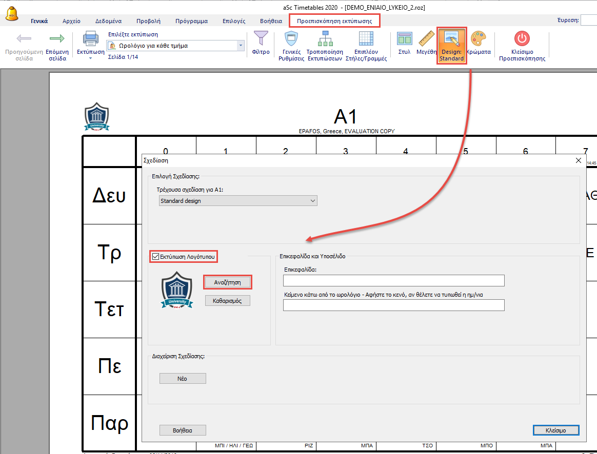 Εάν επιθυμείτε να εκτυπώσετε το λογότυπο σας σε κάθε εκτύπωση του ωρολογίου, μπορείτε να το προσθέσετε από το μενού Γενικά/Προεπισκόπηση Εκτύπωσης/Desing: Standard.