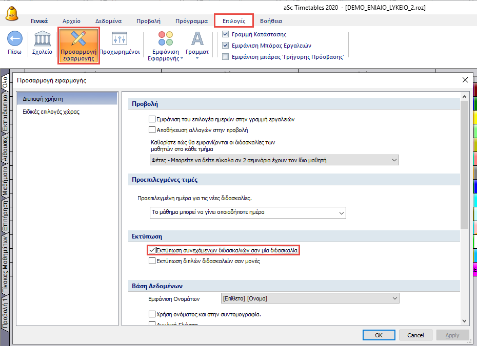 Όταν ενεργοποιήσετε αυτή την επιλογή, το πρόγραμμα θα εκτυπώνει όλες τις συνεχόμενες μονές διδασκαλίες ως μία μεγάλη διδασκαλία.