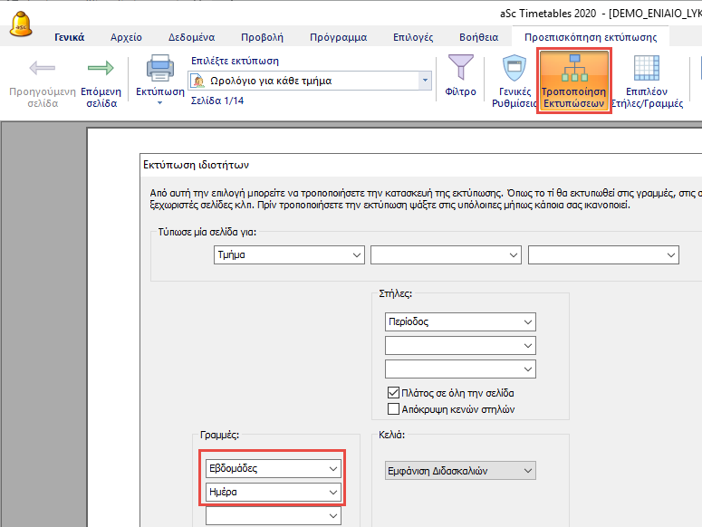 Από προεπιλογή το πρόγραμμα εκτυπώνει δύο εβδομάδες ή δύο εξάμηνα σε μία σελίδα, με τη γραμμή διαχωρισμένη για κάθε εβδομάδα. Το επάνω κομμάτι είναι η εβδομάδα Α και το κάτω η εβδομάδα Β.