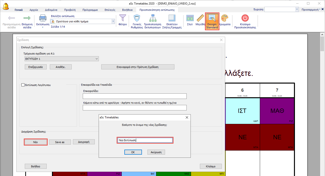 Κάτω από το ωρολόγιο μπορείτε να εκτυπώσετε τίτλους που εμφανίζουν λίστες μαθημάτων, εκπαιδευτικών ή αιθουσών, ώστε οι μαθητές και οι εκπαιδευτικοί να καταλαβαίνουν τα χρώματα του και τις συντομογραφίες του ωρολογίου.