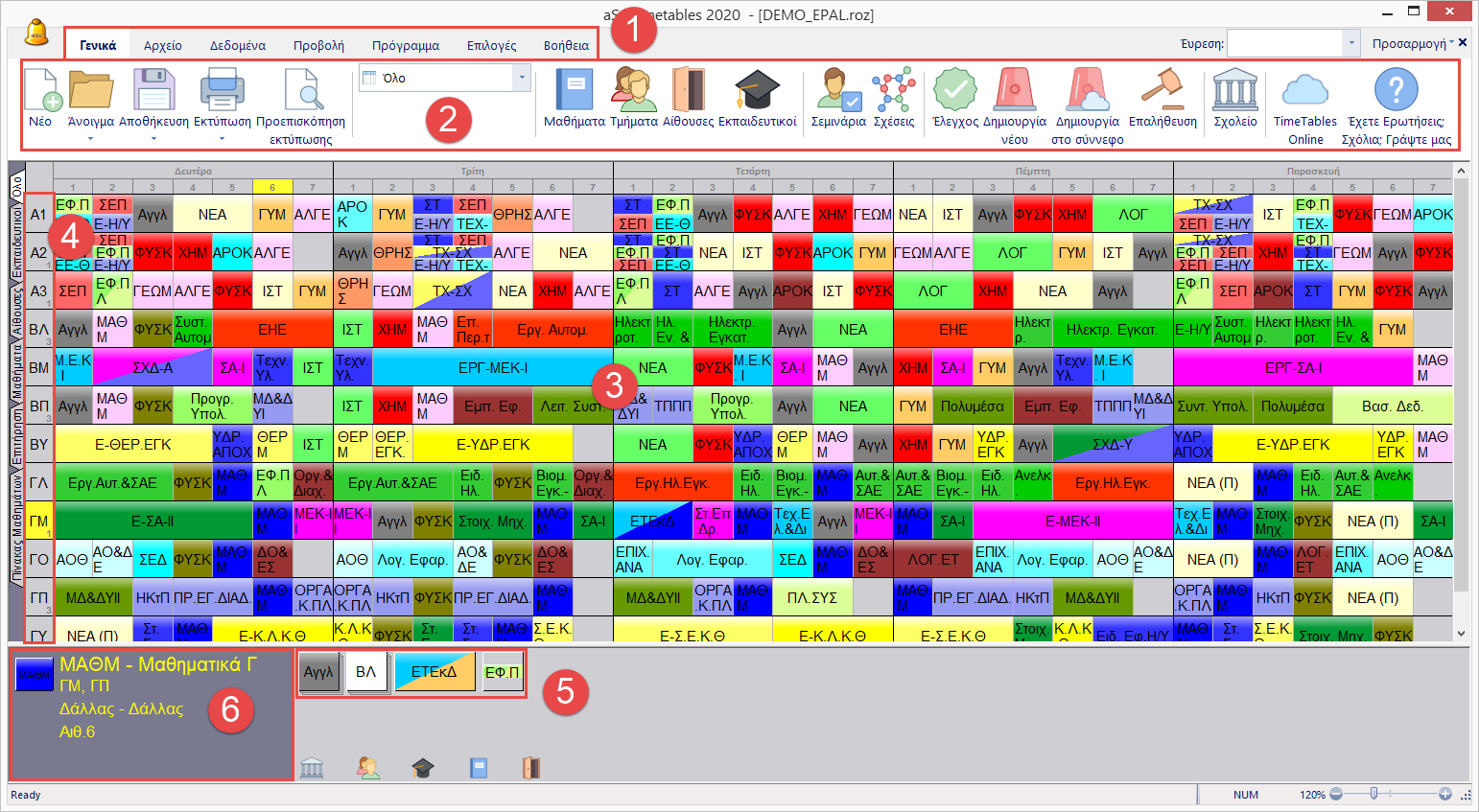 Τα τμήματα εμφανίζονται στις γραμμές και οι μέρες και οι περίοδοι στις στήλες.