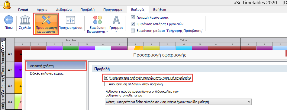 Από προεπιλογή το πρόγραμμα δείχνει όλες τις μέρες στην συνολική όψη. Εάν για παράδειγμα θέλετε να βλέπετε μόνο μία μέρα μπορείτε να ενεργοποιήσετε την επιλογή ημερών.