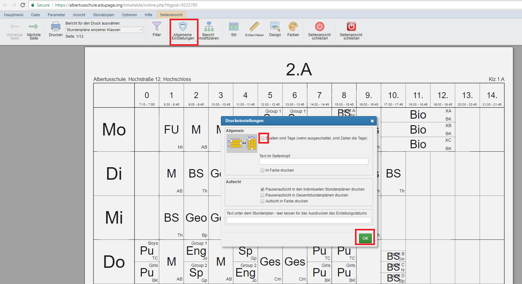 Öffnen Sie bitte den Stundnenplan online, Klick auf SEITENANSICHT, dann auf ALLGEMEINE EINSTELLUNGEN und: