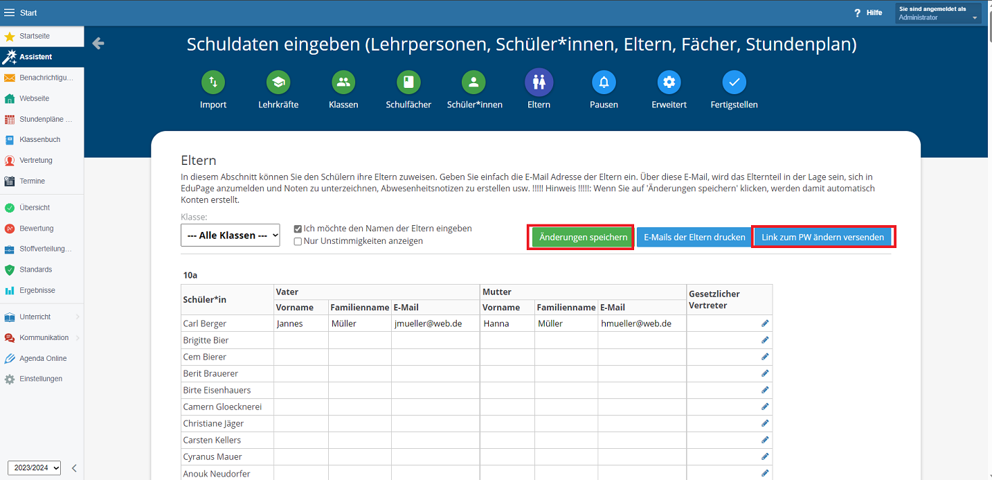 3. Wählen Sie nun aus dem oberen Menü die Option Eltern. Geben Sie jetzt hier die Daten der Eltern ein. Wenn Sie die E-Mail-Adressen eingeben haben und auf Änderungen speichern klicken, werden automatisch die Elternkonten erstellt. Der Anmeldename ist die E-Mail-Adresse selbst falls kein separater hinterlegt ist. Informieren Sie die Eltern über ihre neuen EduPage-Konten, indem Sie auf Link zum PW ändern versenden klicken. Dadurch erhalten die Elternteile eine E-Mail mit der Info dass ein Konto erstellt worden ist und einem Link zum Setzen des Passworts.