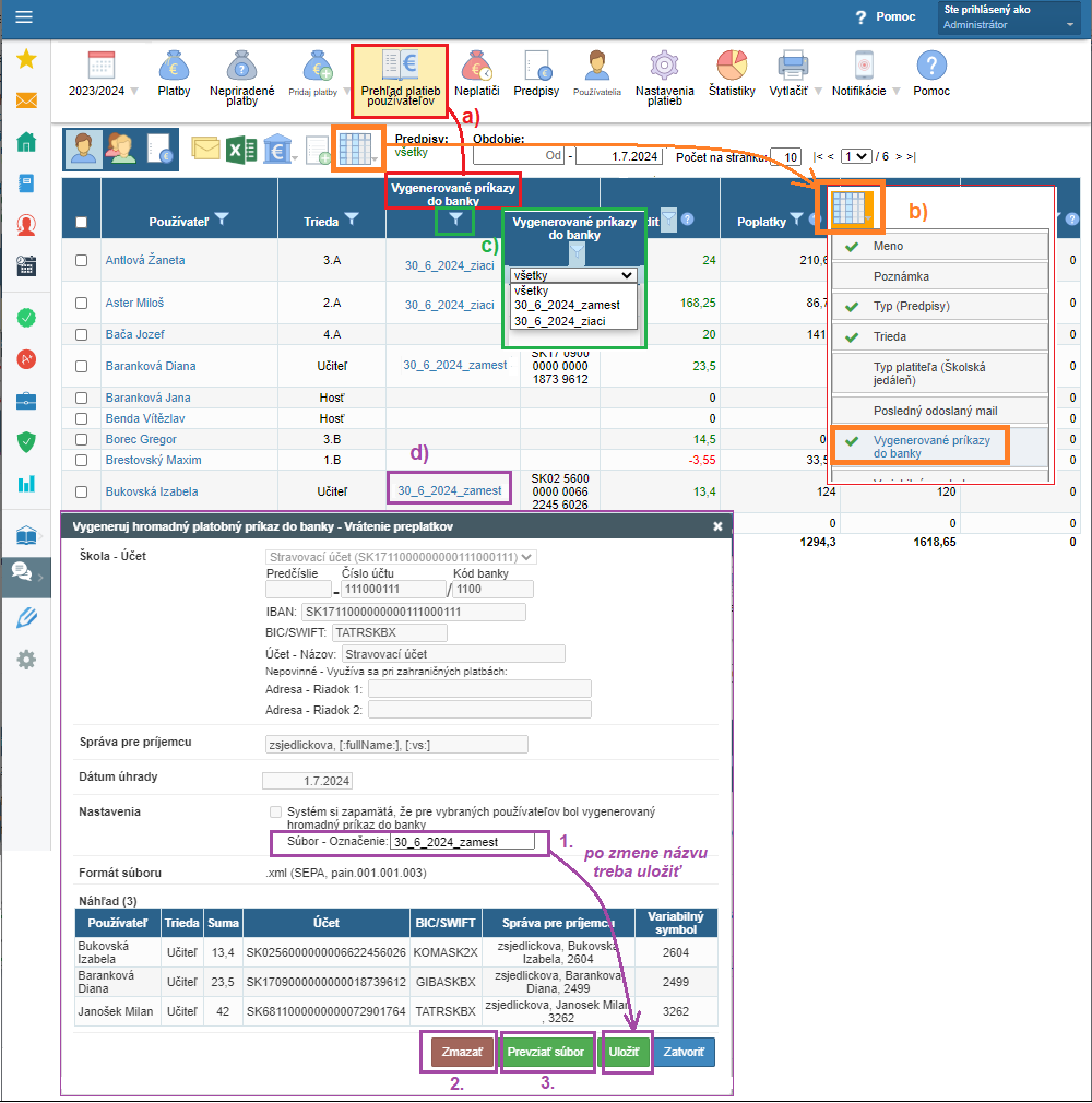 a) v 'Prehľade platieb používateľov' sa nachádza stĺpec 'Vygenerované príkazy do banky'