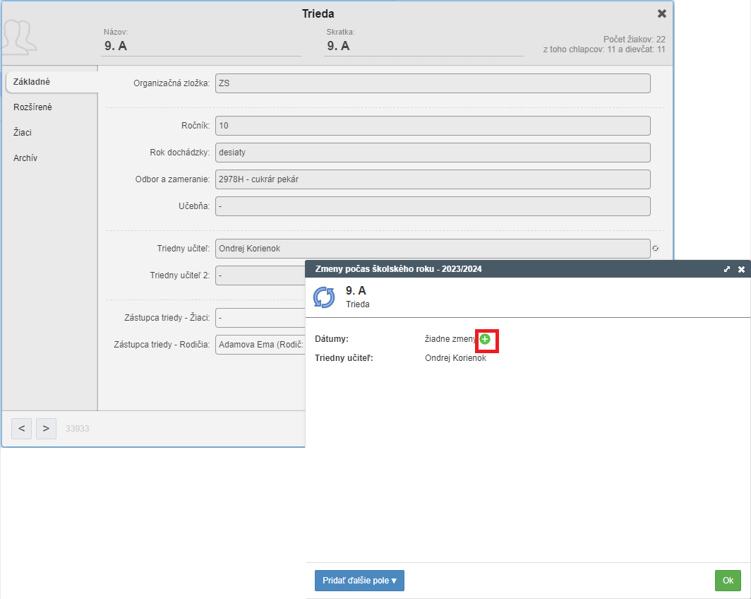 a následne vyberiete učiteľa, ktorý začal učiť danú triedu, v našom príklade Ondrej Korienok a dátum, od kedy nastala zmena triedneho učiteľa napr. 27.2.:
