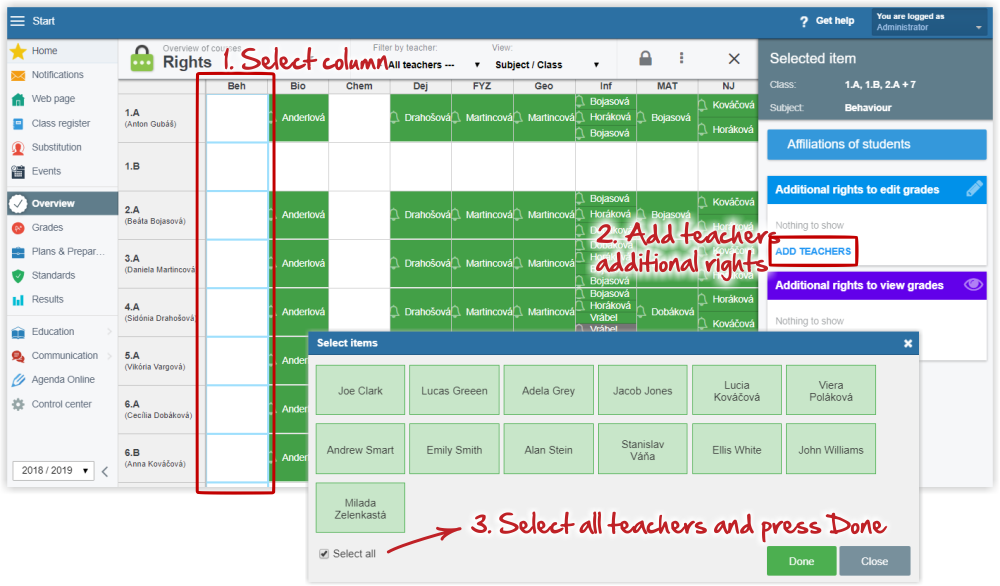 Pažymėkite stulpelį „Elgesys“ spustelėdami jo pavadinimą. Stulpelis rodomas mėlynai. Dešinėje ekrano dalyje, skiltyje „Papildomos teisės redaguoti pažymius“, pasirinkite „Pridėti mokytojų“. Pasirinkite mokytojus ir paspauskite „Atlikta“.