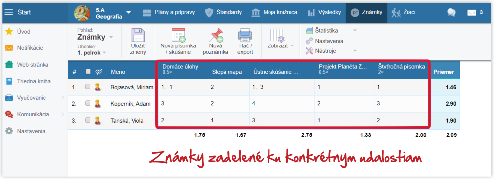 Lepším riešením je vytvoriť pre každú písomku, skúšanie či domácu úlohu v žiackej knižke nový stĺpec. Tento stĺpec voláme "udalosť žiackej knižke". Môžu to byť napr. domáce úlohy, ústne skúšanie, slepá mapa, štvrťročná písomka.