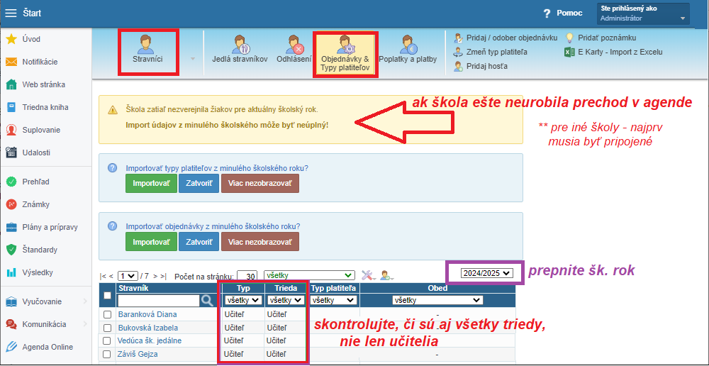 ---> v module jedáleň - v starom šk. roku - tiež už nerobte žiadne zásahy - či do celkových nastavení alebo nastavení stravníkov / objednávok
