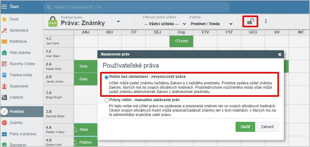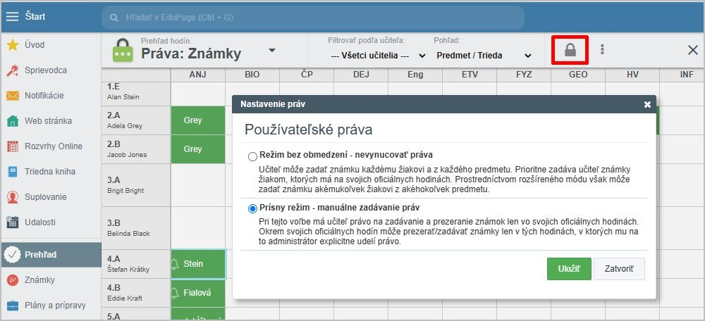 V prísnom režime práv je možné pridať rozšírené právo na prezeranie/zapisovanie známok aj v hodinách, ktoré učiteľ neučí.