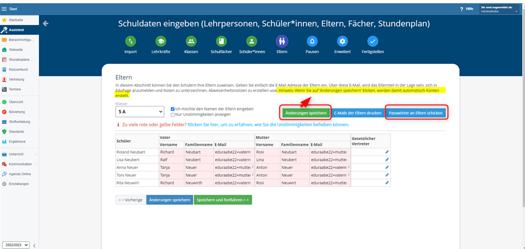 Um Elternkonten anzulegen, wählen Sie ebenfalls das Menü Schuldaten und darin den Menüpunkt Eltern. Tragen Sie hier die Namen inklusive der E-Mail-Adressen der Eltern ein, denen Sie ein Konto einrichten möchten.