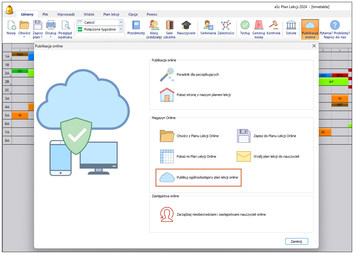 W nowo otwartym oknie kliknij Publikuj ogólnodostępny plan lekcji online. Plan zostanie przesłany na Twoją stronę EduPage i będzie dostępny dla odwiedzających.