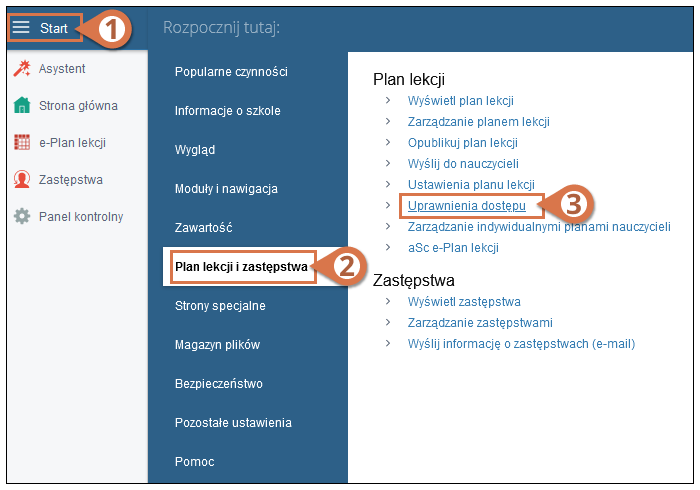 Po opublikowaniu planu lekcji możesz dodatkowo skonfigurować parametry wyświetlania na stronie. Aby to uczynić, należy zalogować się na stronę szkoły i wybrać Modyfikuj, Plan lekcji i zastępstwa, a następnie Uprawnienia dostępu.