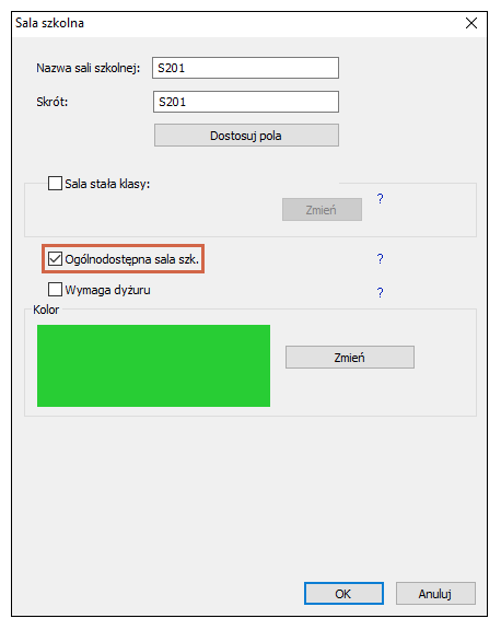 - Jeżeli w szkole nie precyzujemy w jakiej sali, która lekcja i nauczyciel mają się znaleźć, możemy większość (bądź wszystkie) sale zaklasyfikować jako ogólnodostępne. W takiej sytuacji pozwalamy programowi wybierać spośród większej grupy sal, właściwą salę dla danej lekcji, a my nie musimy precyzować, która lekcja gdzie ma się odbywać.