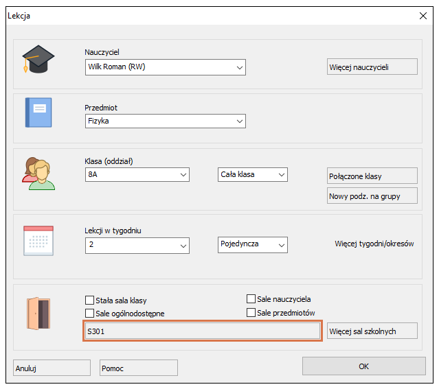 Dla niektórych lekcji nie jest wskazane używanie sali ogólnodostępnej. Np. fizyka musi odbywać się tylko w sali nr 301 (sala fizyczna).